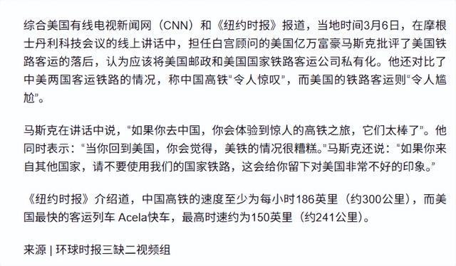 2025年3月,他在科技会议上大夸特夸中方高铁。他说去中国坐高铁就像穿越到了未来,回美国坐火车就像钻进了古董店。他还多次在X平台上教训美国网友,没去过中国就不知道那里的基建有多棒。
